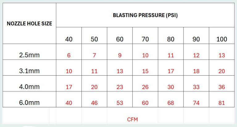 The chart gives you an idea of nozzle Bore Size Vs CFM Vs PSI (blasting pressure) A single phase compressor for example can rarely achieve over 25CFM, unless it's got a dual motor...3 Phase compressor generally give you a significantly higher CFM.